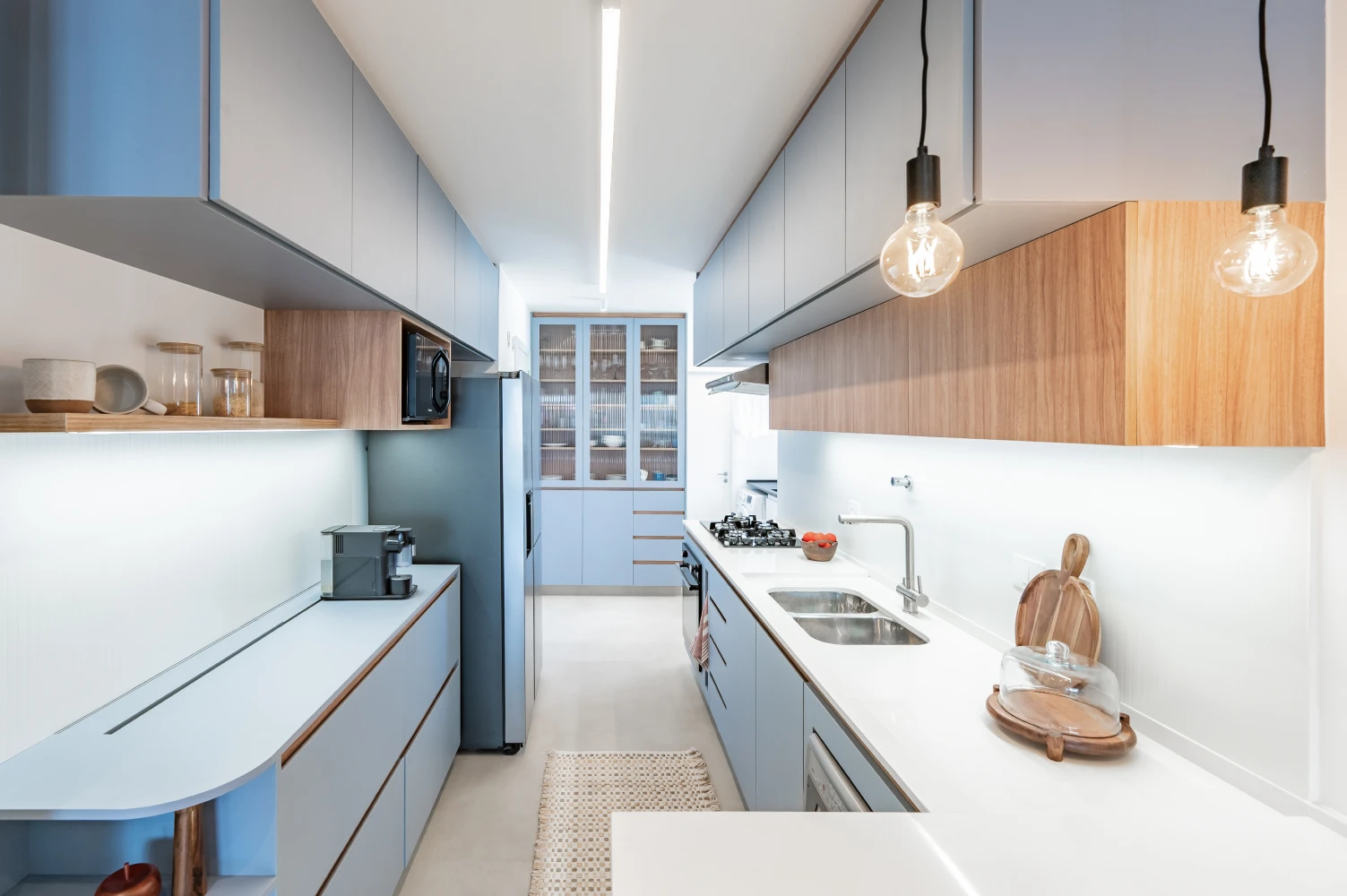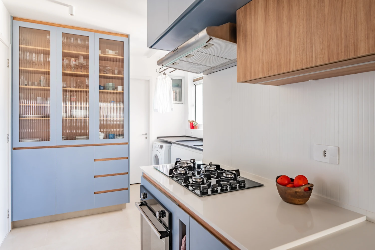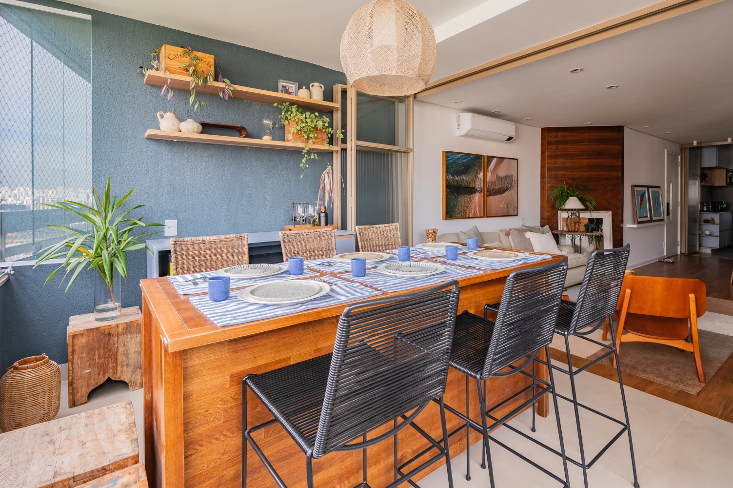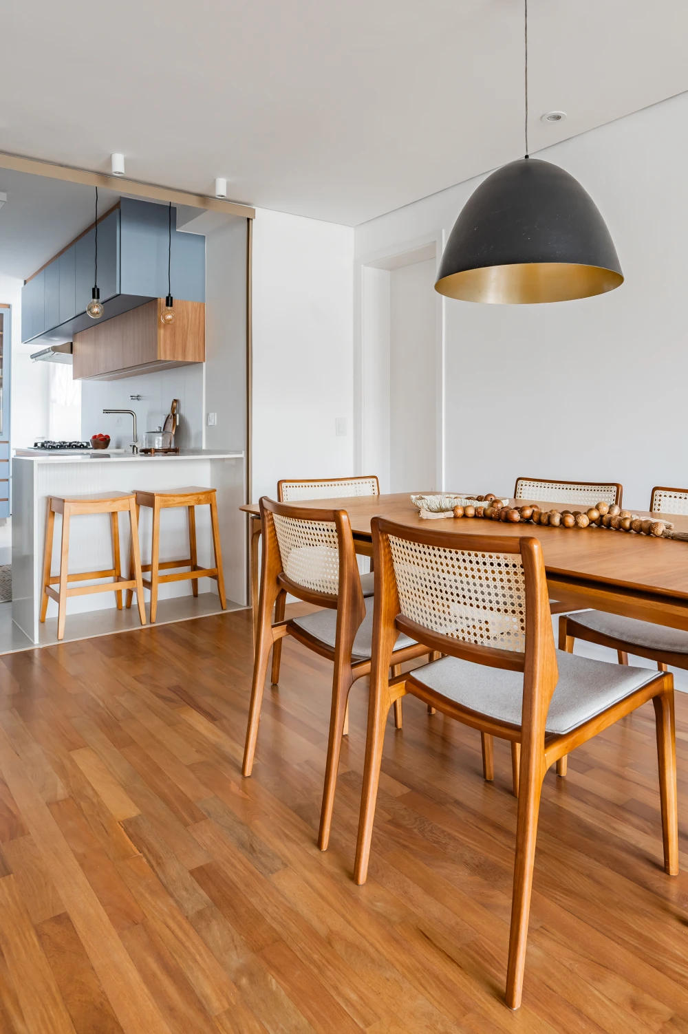 Projeto contemporâneo com toques afetivos, focado em transformar uma cozinha original nunca reformada e deixar a área social mais acolhedora.